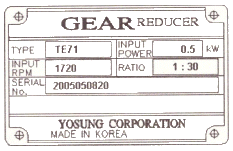 다음 그림은 기어 감속기에 부착된 명판이다. 이 감속기의 출력회전수는 약 얼마인가?