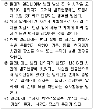 다음 중 알리바이에 대한 설명으로 옳고 그름의 표시(O, X)가 바르게 된 것은?