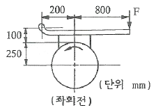 그림과 같은 블록 브레이크의 드럼축에 500N·m의 토크가 작용하고 있다. 축의 회전을 정지시키는데 필요한 최소 힘 F(N)는? (단, 브레이크의 마찰계수는 0.2 이다.)