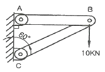 그림과 같은 트러스 구조물에서 B점에서 10kN의 수직 하중을 받으면 BC에 작용하는 힘은 몇 kN인가?