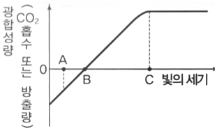 다음 그림은 광합성과 빛의 세기와의 관계를 나타낸 것이다. A와 같이 광합성을 위한 CO2의 방출량이 같게 되는 시점의 광도는?