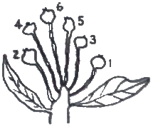 다음 그림은 황갈색배의 한개 회충에서 꽃이 피고 열매가 맺는 차례를 나타낸 것이다. 적과(열매솎음)을 할 때 어느 것을 남기는 것이 적당한가?