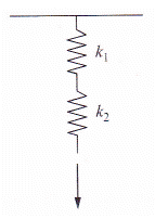그림과 같은 스프링에서 스프링 상수가 k1=10[N/mm], k2=15[N/mm] 면 합성 스프링 상수값은 약 몇[N/mm]인가?