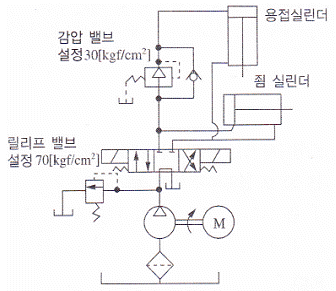 그림의 회로도에서 죔 실린더의 전진 시 최대 작용압력은 몇 [kgf/cm2] 인가?