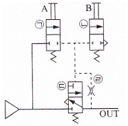 도면에서 밸브 ㉠의 입력으로 A가 ON되고, ㉡의 신호 B를 OFF로 해서 출력 Out이 On 되게 한 다음 신호 A를 OFF로 한다면 출력은 어떻게 되는가?