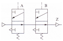 다음과 같이 2개의 3/2way 밸브를 연결한 상태의 회로는 어떠한 논리를 나타내는가?
