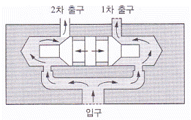 다음 그림은 방향 조정 장치에 사용되어 양쪽 실린더에 같은 유량이 흐르도록 하는 것이다. 이 밸브의 명칭은?