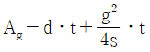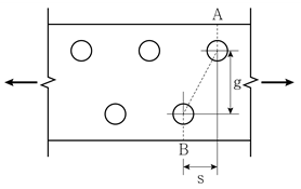 그림과 같이 강재를 사용한 인장부재(두께 t)의 볼트 연결부(구멍직경 d)가 있다. 예상되는 파단선이 A-B일 때 순단면적(An)은? (단, Ag는 총단면적이다)