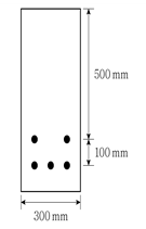 그림과 같이 동일한 철근 다섯 가닥이 배근된 철근콘크리트 보의 유효깊이 d[mm]는? (단, 철근 하나의 공칭단면적은 300mm2이고, 콘크리트의 설계기준압축강도 fck=20MPa, 철근의 항복강도 fy=300MPa이다)