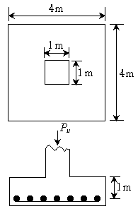 그림과 같이 계수축방향 하중 Pu가 편심 없이 작용하는 독립확대기초에서 2방향 전단력은 1방향 전단력의 몇 배인가? (단, 확대기초 주철근의 유효깊이는 1m이다)