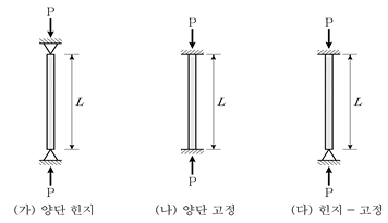 그림과 같이 재료, 단면, 길이는 모두 같으나 서로 다른 단부 조건을 가지고 있는 3개의 압축부재에 대하여 좌굴하중(임계하중)이 큰 것부터 순서대로 바르게 나열한 것은?