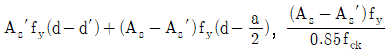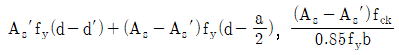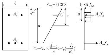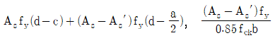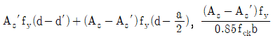 그림과 같은 복철근 직사각형보의 공칭휨강도 Mn및 등가직사각형 응력블록의 깊이 a를 구하는 식은? (단, 인장철근 및 압축철근은 항복하였고, 콘크리트 설계기준압축강도는 fck, 철근의 설계기준항복강도는 fy이며, 콘크리트구조 휨 및 압축 설계기준(KDS 14 20 20: 2016)을 따른다) (순서대로 Mn, a)