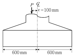그림과 같이 기초에 편심하중이 작용할 때 기초 저면에 생기는 응력 분포 형상은? (단, 단위폭으로 고려하고, e=100mm, 지반 조건은 균일하며, 자중은 무시한다)