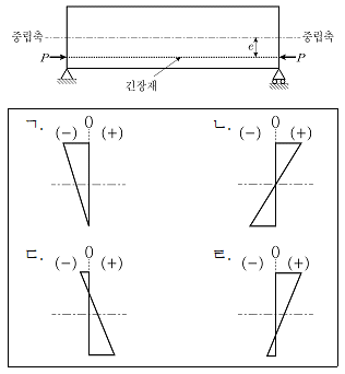 그림과 같이 중립축으로부터 편심거리 e만큼 떨어진 지점에 긴장력 P를 작용시킨 프리스트레스트 콘크리트(PSC) 보의 중앙 단면에서의 응력 분포로 적절한 것은? (단, PSC 보의 프리스트레스만을 고려하고 자중은 무시하며, (+)는 압축응력, (-)는 인장응력으로 정의한다. 단면은 직사각형이며, 이외 다른 조건은 고려하지 않는다)