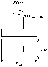 그림과 같이 연직하중 P와 휨모멘트 M이 바닥판과 기둥의 중심에 작용하는 철근콘크리트 확대기초의 최대 지반응력[kN/m2]은? (단, 기초의 자중은 무시한다)