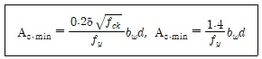 KDS(2016) 설계기준에서는 휨부재의 최소 철근량으로 다음 두 가지 식으로 계산한 값 중에서 큰 값 이상을 사용한다. 이 두 가지 식을 함께 사용하는 이유는? (단, fck는 콘크리트의 설계기준 압축강도이며, fy는 철근의 설계기준 항복강도, bw는 단면의 폭, d는 단면의 유효높이이다)