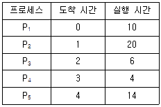 다음 표는 단일 CPU에 진입한 프로세스의 도착 시간과 처리하는 데 필요한 실행 시간을 나타낸 것이다. 규정 시간량이 10인 라운드 로빈 알고리즘으로 스케줄링할 때, 평균 대기시간으로 옳은 것은? (단, 프로세스간 문맥교환에 따른 오버헤드는 무시하며, 주어진 5개의 프로세스 외에 처리할 다른 프로세스는 없다고 가정한다.)