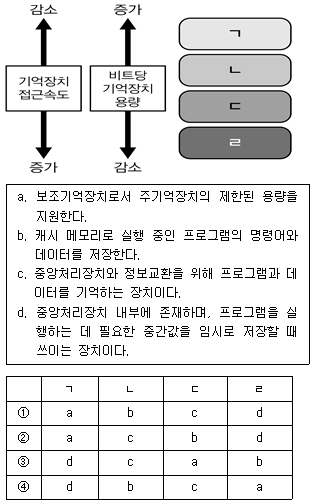 메모리 계층구조에 관한 그림의 ㄱ~ㄹ에 해당하는 설명을 옳게 연결한 것은?