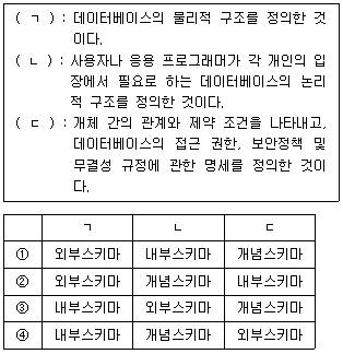 데이터베이스 스키마에 관한 설명이다. ( ) 안에 들어갈 용어로 옳은 것은?