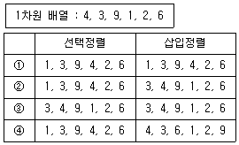 선택정렬과 삽입정렬을 수행하여 다음 숫자를 오름차순으로 정렬할 경우, 각 정렬의 첫 번째 단계 결과를 옳게 나열한 것은? (단, 숫자는 1차원 배열로 구성되어 있다.)