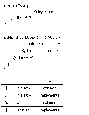 자바 프로그래밍에서 ACore 클래스는 다중 상속을 지원하는 클래스이며, BCore 클래스에게 상속한다. ( ) 안에 들어갈 용어로 옳은 것은?