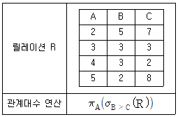 다음 릴레이션 R에 대한 관계대수 연산 결과로 옳은 것은?