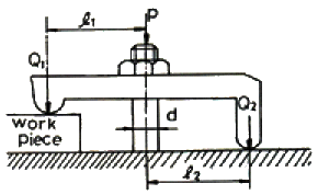 다음 그림에서 ℓ1 = 40mm, ℓ2 = 30mm, d = 12mm, P = 140kgf 일 때 공작물에 가해지는 힘 Q1은 얼마인가?