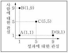 블레이크(Blake)와 모튼(Mouton)의 관리그리드 모형에서 제시하고 있는 리더의 행동유형과 경향을 옳게 짝지은 것은? [단, (x, y)=(성과에 대한 관심, 사람에 대한 관심)]