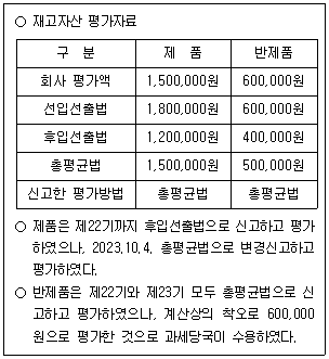내국법인 (주)우주의 제23기(2023.1.1.~12.31.)말 현재 재고자산 관련 자료이다. 재고자산에 대한 제23기의 세무조정은?