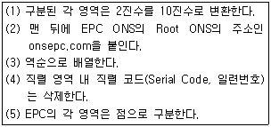 EPC 코드가 EPC ONS에 질의되기 위해서는 FQDN으로 변환되어야 하는데 아래 상자내의 항목들을 변환순서대로 바르게 나열한 것은?