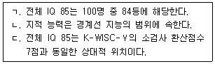 중학교 2학년 A는 K-WISC-Ⅴ에서 전체 IQ가 85로 나타났다. 이 결과에 관한 설명으로 옳은 것을 모두 고른 것은?