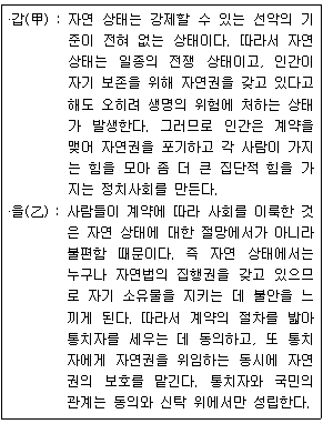 <보기>의 근대 사회 계약론자 갑(甲), 을(乙)에 대한 설명으로 가장 옳은 것은?