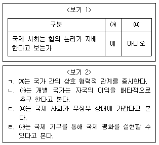 <보기 1>의 ㈎, ㈏는 국제 사회를 보는 관점이다. 이에 대한 옳은 설명을 <보기 2>에서 모두 고른 것은? (단, ㈎, ㈏는 현실주의적 관점과 자유주의적 관점중 하나이다.)