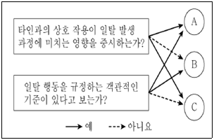 <보기>는 일탈 행위 A~C를 질문에 따라 구분한 것이다. 이에 대한 설명으로 가장 옳은 것은? (단, A~C는 각각 낙인 이론, 아노미 이론, 차별 교제 이론 중 하나이다.)
