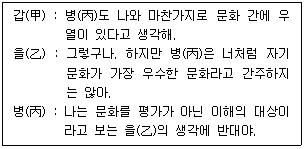 <보기>에서 갑(甲)~병(丙)의 문화 이해 태도에 대한 설명으로 가장 옳은 것은? (단, 갑(甲)~병(丙)의 문화 이해 태도는 각각 문화 사대주의, 자문화 중심주의, 문화 상대주의 중 하나이다.)