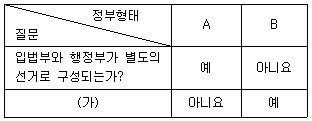 <보기>의 표는 정부형태 A, B를 구분한 것이다. 이에 대한 설명으로 가장 옳은 것은? (단, A, B는 각각 전형적인 대통령제와 의원 내각제 중 하나이다.)