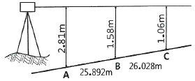 경사면에 따라 거리를 측정하여 다음 그림과 같았다. 이 때의 AC의 수평거리를 구한 값은?