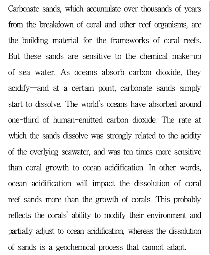 Ocean acidification affects the growth of corals more than the dissolution of coral reef sands.