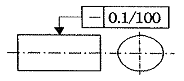지시한 원통면의 진직도가 임의의 모선 위에서 임의로 선택한 100㎜ 길이에 대해, 축선을 포함한 평면내에 있어 0.1㎜ 만큼 떨어진 2개의 평행한 직선 사이에 있어야 한다.