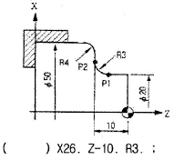 그림은 CNC선반 프로그렘에서 P1에서 P2로 진행하는 블록을 나타낸 것이다. ( ) 안에 알맞은 명령어는?