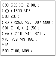 다음은 머시닝센터 프로그램의 일부를 나타낸 것이다. ( ) 안에 내용을 옳게 나열한 것은?