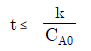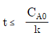 정용 회분식 반응기에서 단분자형 0차 비가역 반응에서의 반응이 지속되는 시간t의 범위는? (단, CA0는 A성분의 초기농도, k는 속도상수를 나타낸다.)