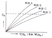 단일반응 A→R의 반응을 동일한 조건하에서 촉매 A,B,C,D를 사용하여 적분반응기에서 실험하였을 때 다음과 같은 원료성분 A의 전화율 XA와 V/FO(또는 W/FO를 얻었다. 촉매 활성이 가장 큰 것은? (단, V는 촉매체적, W는 촉매질량, FO는 공급원료 mole 수 이다.)