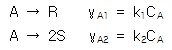 다음과 같은 두 일차 병렬반응이 일정한 온도의 회분식 반응기에서 진행 되었다. 반응시간이 1000초 일 때 반응물 A가 90% 분해되어 생성물은 R이 S보다 10배 생성되었다. 반응 초기에 R과 S의 농도를 0으로 할 때 k1, k2 k1/k2 는?