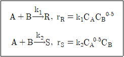 액상반응이 아래와 같이 병렬반응으로 진행될 때, R을 많이 얻고 S를 적게 얻기 위한 A와 B의 농도는?