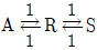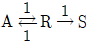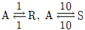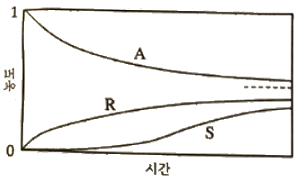 다음 그림은 기초적 가역 반응에 대한 농도 시간 그래프이다. 그래프의 의미를 가장 잘 나타낸 것은? (단, 반응방향 위 숫자는 상대적 반응속도 비율을 의미한다.)