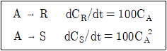 플러그흐름반응기에서 순수한 A가 공급되어 아래와 같은 비가역 병렬 액상반응이 A의 전화율 90%로 진행된다. A의 초기농도가 10mol/L일 경우 반응기를 나오는 R의 농도(mol/L)는?