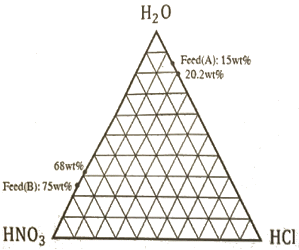 1기압에서의 HCl, HNO3, H2O의 ternary plot과 공비점 및 용액 A와 B가 아래와 같을 때 틀린 설명은?