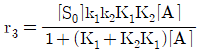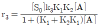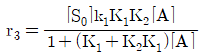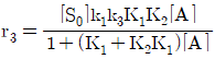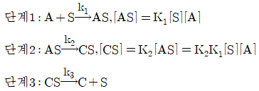 A → C 의 촉매반응이 다음과 같은 단계로 이루어진다. 탈착반응이 율속단계일 때 Langmuir Hinshelwood모델의 반응속도식으로 옳은 것은? (단, A 는 반응물, S 는 활성점, AS 와 CS 는 흡착 중간체이며, k 는 속도상수, K 는 평형상수, SO 는 초기 활성점, []는 농도를 나타낸다.)
