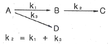 다음과 같은 플러그 흐름 반응기에서의 반응시간에 따른 CB(t)는 어떤 관계로 주어지는가? (단, k는 각 경로에서의 속도상수, CAO는 A의 초기농도, t는 시간이고, 초기에는 A만 존재한다.)